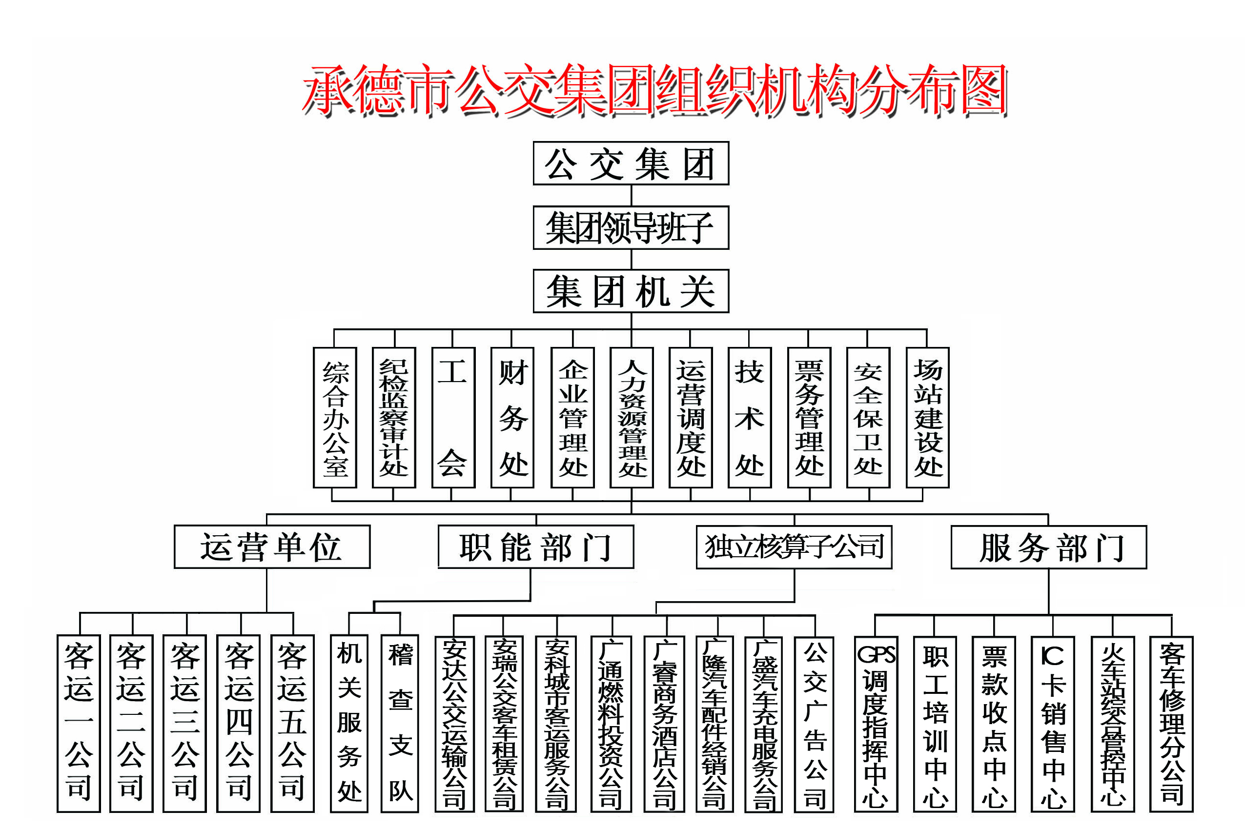 承德公交集團有限責任公司(原名:承德市公共交通總公司),于2011年12月28日正式掛牌成立。這標志著承德公交實現(xiàn)了由傳統(tǒng)的運輸企業(yè)向現(xiàn)代化綜合性交通和一業(yè)為主、多元經(jīng)營的現(xiàn)代企業(yè)的轉(zhuǎn)變。公交集團成立后,進行必要的機構(gòu)、組織、人事、資產(chǎn)的調(diào)整,提高整體的運營組織和工作機制的效率,逐步向“小機關(guān)、大實體”的管理模式和機制過渡,使公交企業(yè)成為結(jié)構(gòu)合理、產(chǎn)權(quán)清晰、責權(quán)到位、分工明確的現(xiàn)代化企業(yè)。