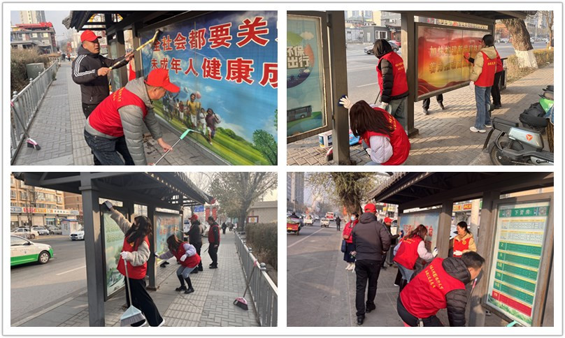 在活動(dòng)過(guò)程中,志愿者們身穿志愿服,有的負(fù)責(zé)清掃站亭地面垃圾、有的負(fù)責(zé)用抹布(刮子)擦拭站亭櫥窗、有的負(fù)責(zé)洗涮保潔用具,大家不怕嚴(yán)寒,分工有序,經(jīng)過(guò)近一個(gè)小時(shí)的辛勤勞動(dòng),站亭和站臺(tái)變得整潔如新,改善了廣大群眾乘坐公交車時(shí)的候車環(huán)境,得到了候車群眾的認(rèn)可和贊揚(yáng)。